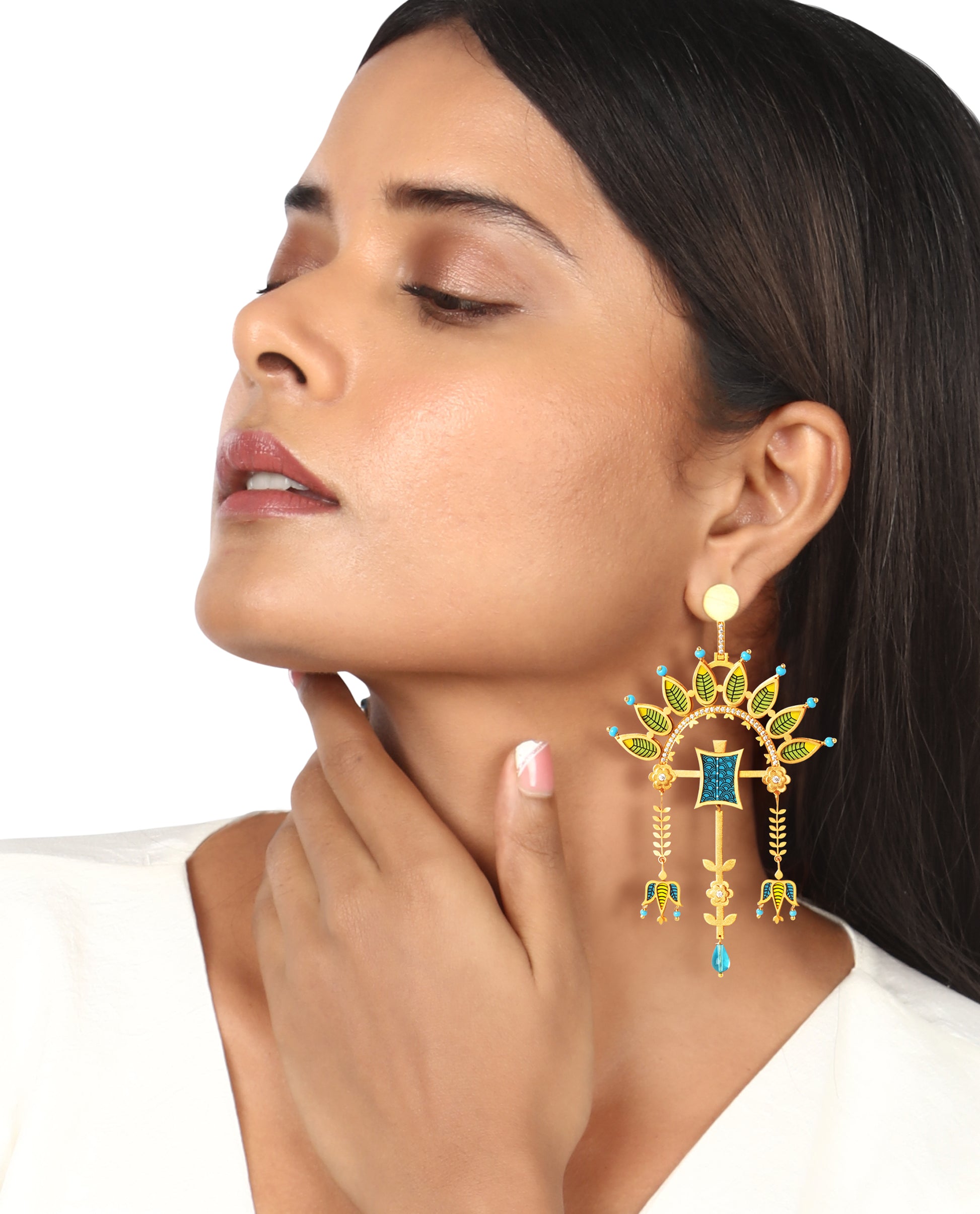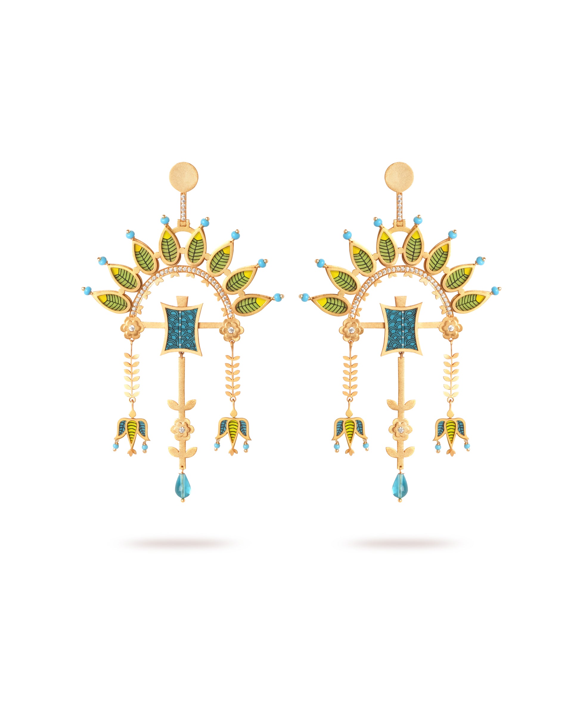 Materials: Hand painted wood with Gold on brass, Cubic Zirconia, Glass and Semi precious beads. Finished with a push post fastening.