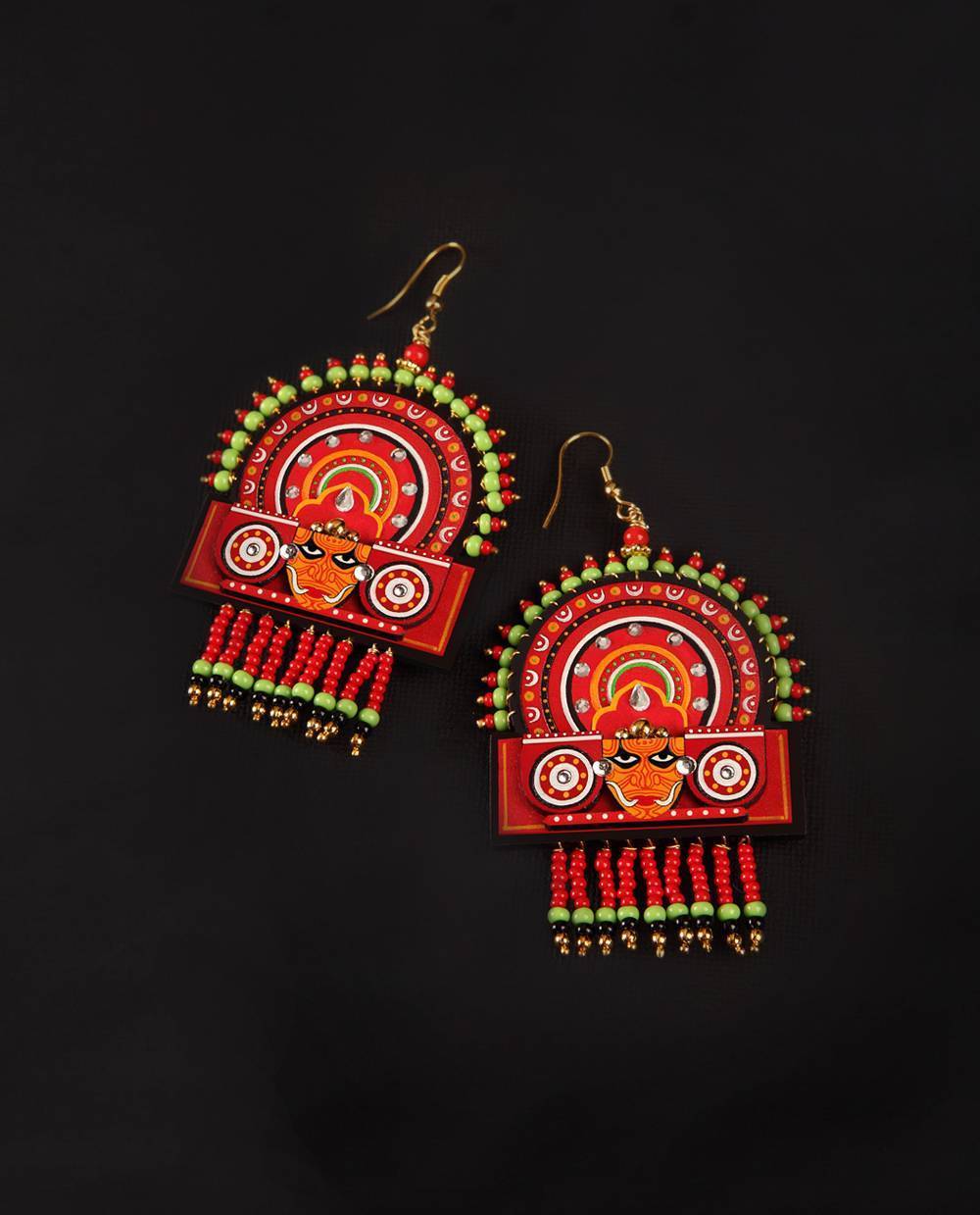 The Bhagawati Necklace and Earrings translate these sacred elements into wearable art. Hand-painted details echo the Theyyam's distinctive facial patterns, while gold-plated brass captures the ritual's divine radiance. Each piece, delicately incorporating traditional symbols into contemporary designs, carries the protective essence and blessings of Bhagawati while honoring Kerala's sacred traditions.