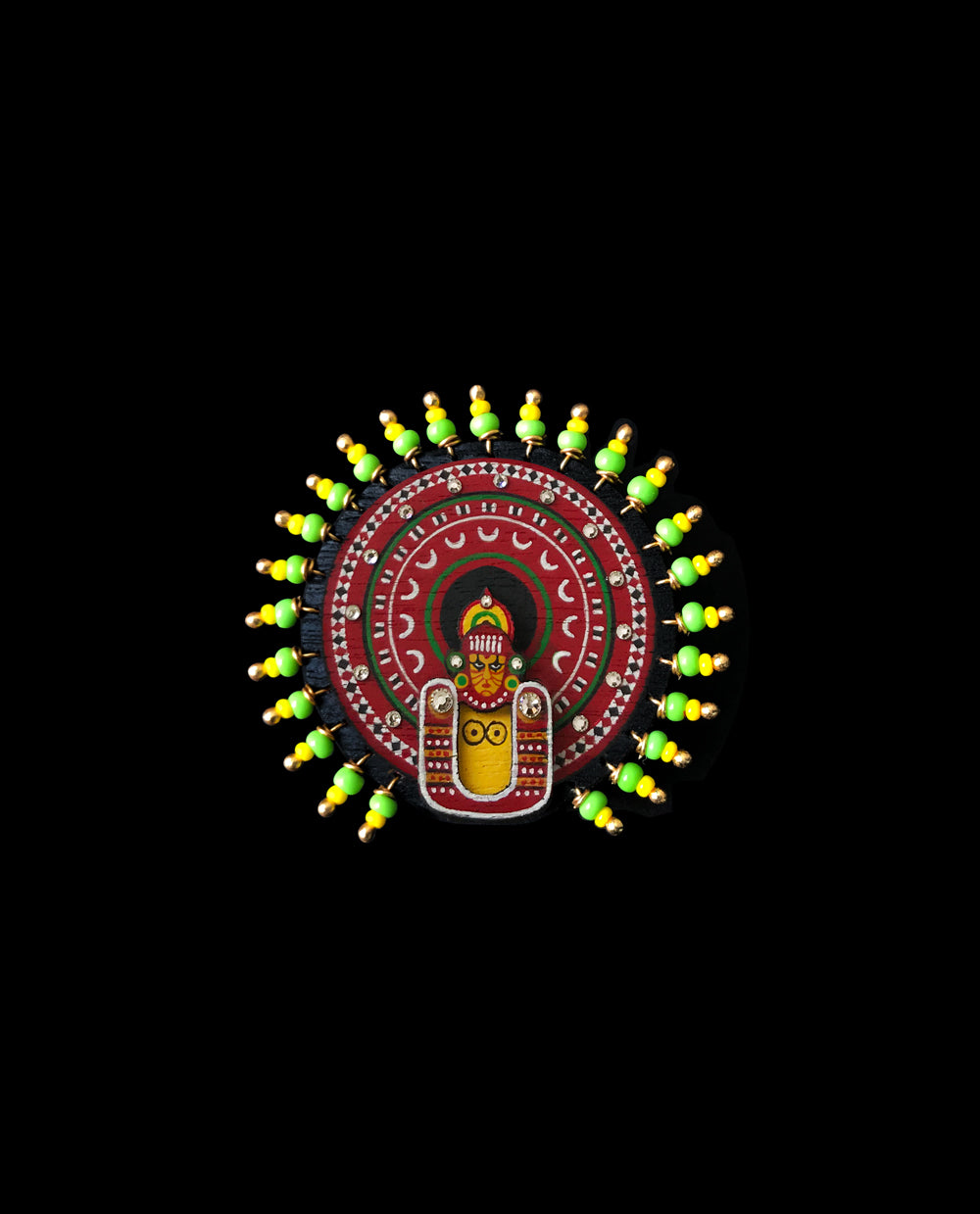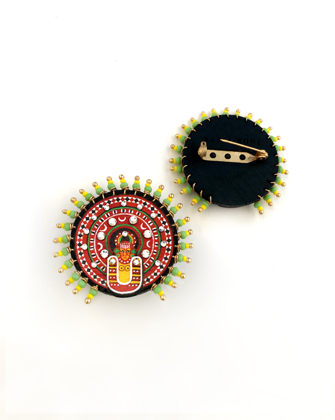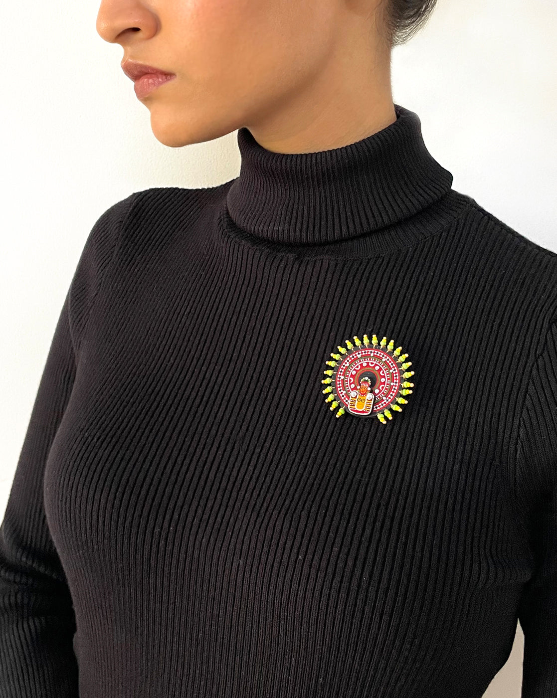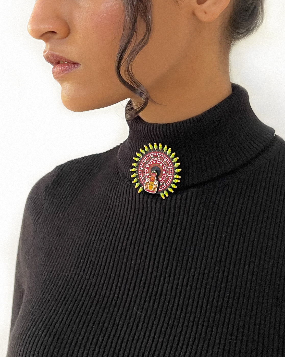 "These 'Chamundi Theyyam Brooch, representing the fierce aspect of the goddess who slayed Mahishasura is hand painted and it carries within the spirit and magic of Theyyam. When you wear a piece, you're not just wearing jewellery, you're carrying the blessings and a fragment of divine heritage of Kerala's sacred performing arts tradition.
