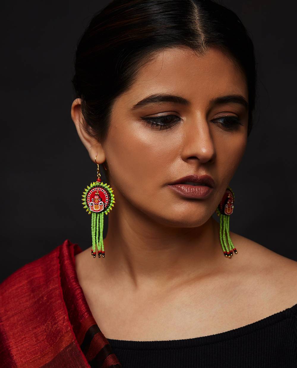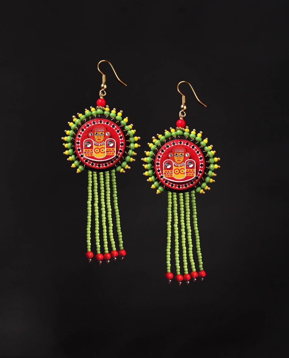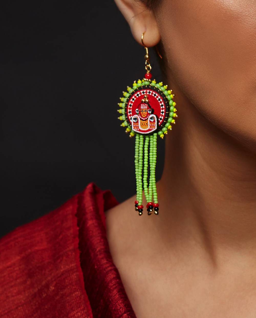 "The 'Chamundi Theyyam earrings, representing the fierce aspect of the goddess who slayed Mahishasura is hand painted and carries within it the spirit and magic of Theyyam. When you wear a piece, you're not just wearing jewellery, you're carrying the blessings and a fragment of divine heritage of Kerala's sacred performing arts tradition.
