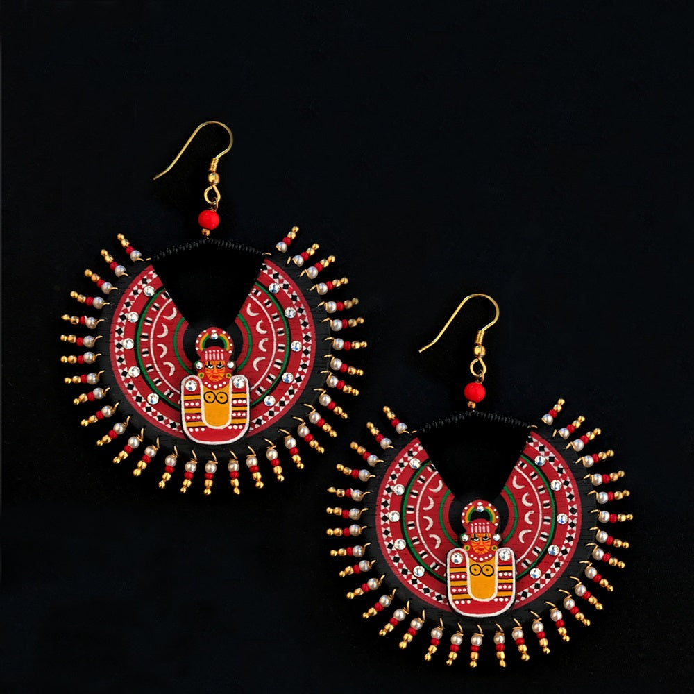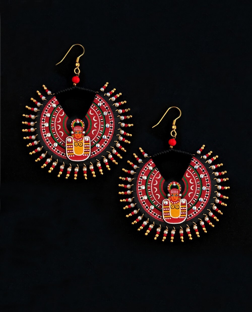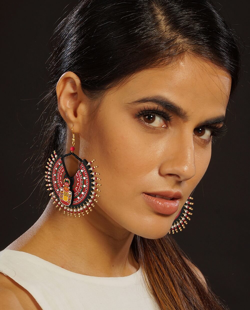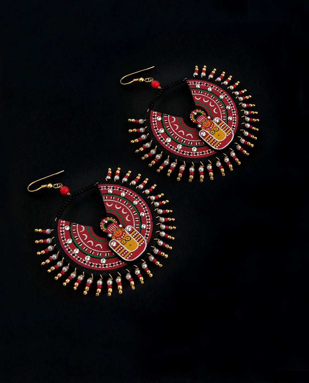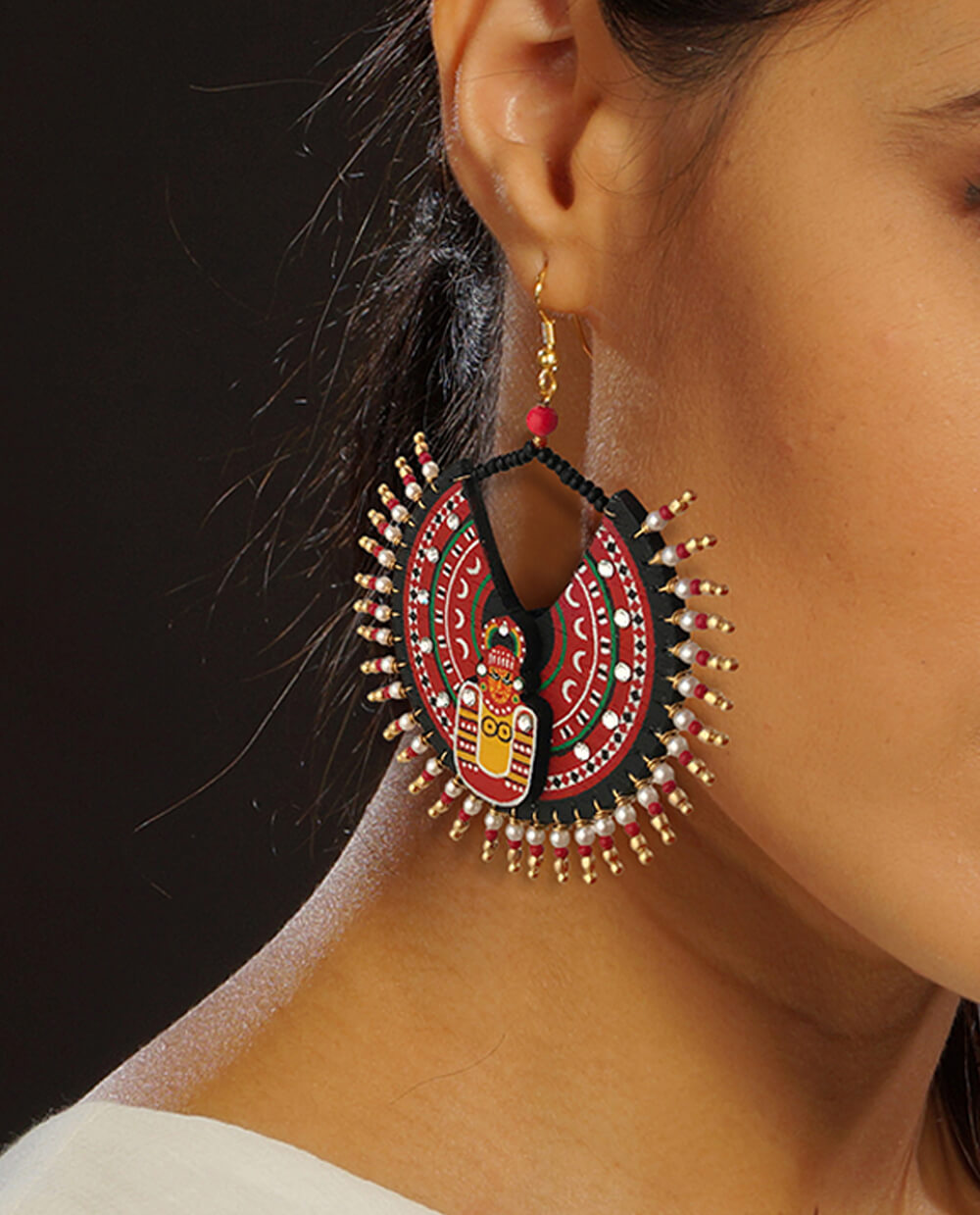 "The 'Chamundi Theyyam Earrings, representing the fierce aspect of the goddess who slayed Mahishasura is hand painted with details on both sides, it carries within it the spirit and magic of Theyyam. When you wear a piece, you're not just wearing jewellery, you're carrying the blessings and a fragment of divine heritage of Kerala's sacred performing arts tradition.