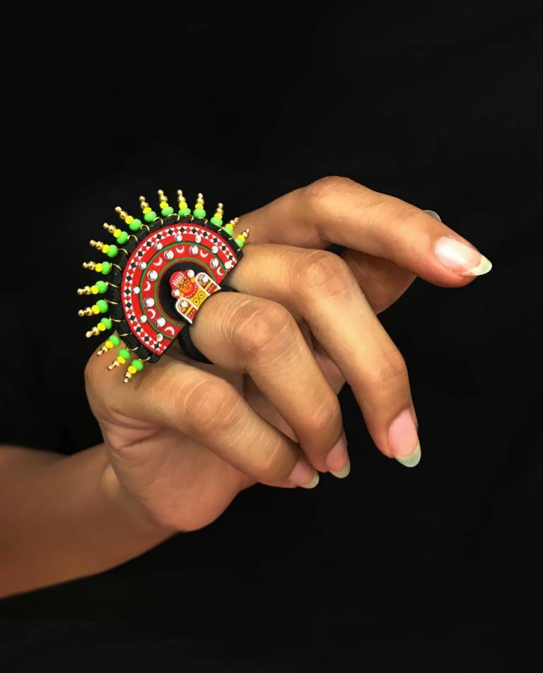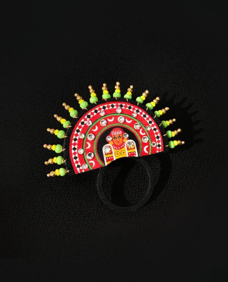 "The 'Chamundi Theyyam Ring, representing the fierce aspect of the goddess who slayed Mahishasura is hand painted and carries within it the spirit and magic of Theyyam. When you wear a piece, you're not just wearing jewellery, you're carrying the blessings and a fragment of divine heritage of Kerala's sacred performing arts tradition.