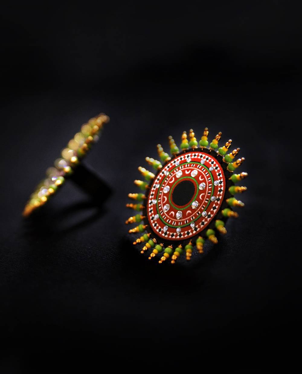 "The 'Chamundi Theyyam Ring, representing the fierce aspect of the goddess who slayed Mahishasura is hand painted and carries within it the spirit and magic of Theyyam. When you wear a piece, you're not just wearing jewellery, you're carrying the blessings and a fragment of divine heritage of Kerala's sacred performing arts tradition.