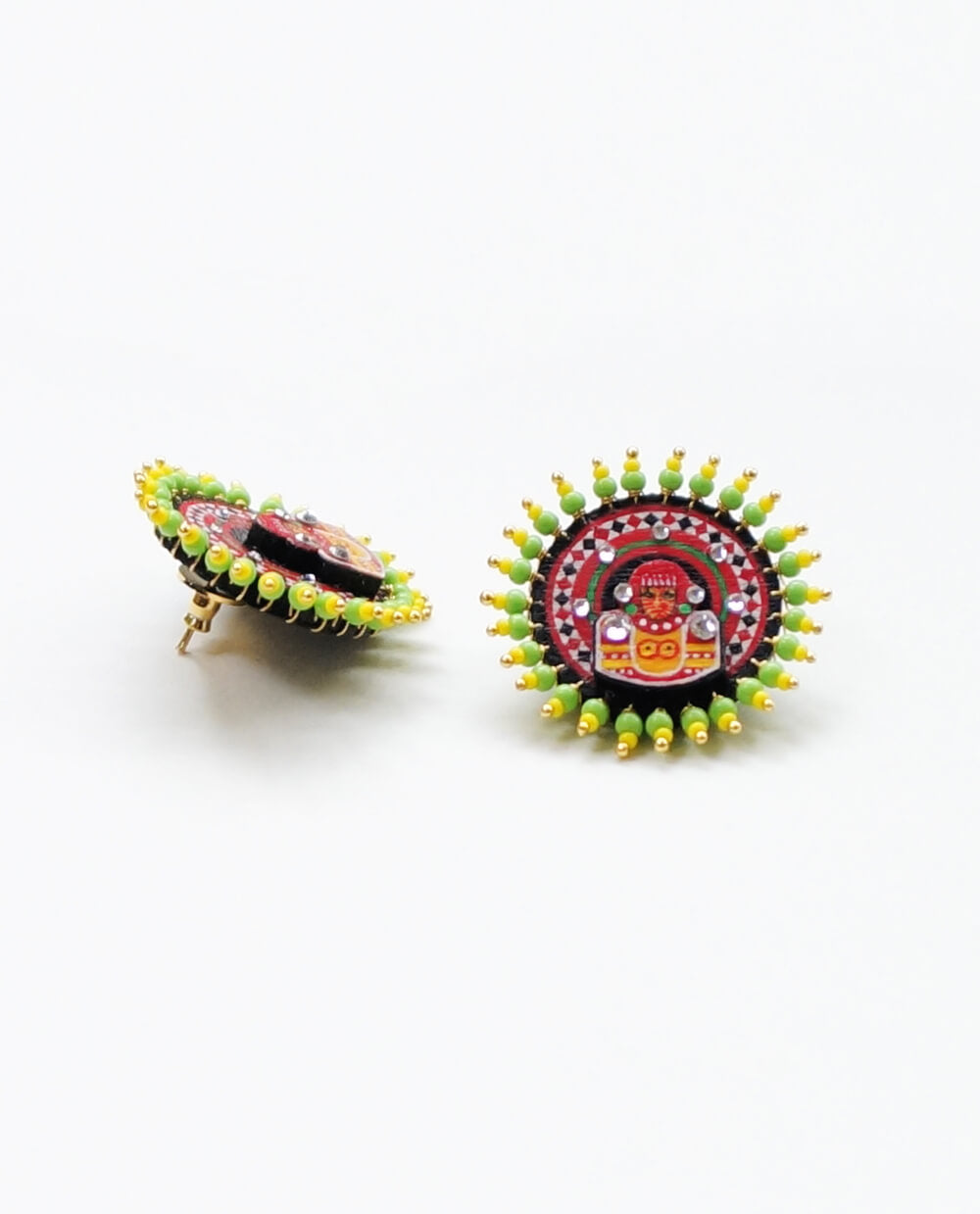 "The 'Chamundi Theyyam Stud Earrings, representing the fierce aspect of the goddess who slayed Mahishasura is hand painted and carries within it the spirit and magic of Theyyam. When you wear a piece, you're not just wearing jewellery, you're carrying the blessings and a fragment of divine heritage of Kerala's sacred performing arts tradition.