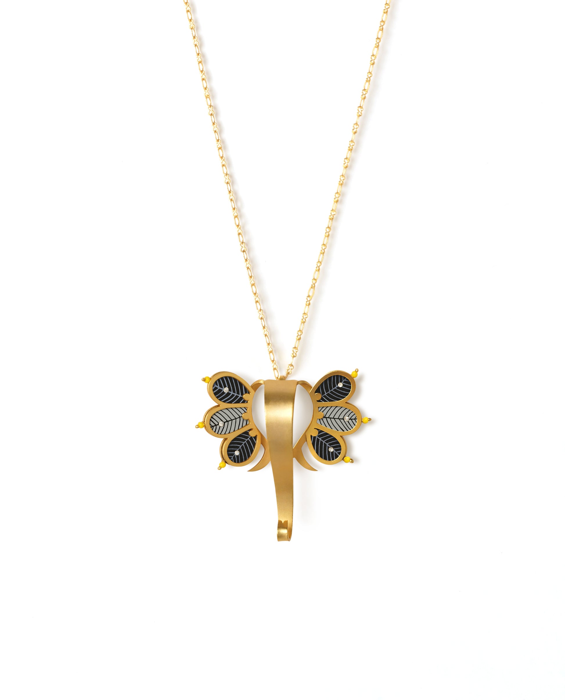 Introducing Gaj Raj Gond Art Necklace in 3 colour-ways, available as necklace and brooch. This gorgeous motif captures the mythical flying elephant at its most beautiful. Inlaid traditional gond pattern in gold-plated brass, the design is accentuated by the gorgeous curve of the trunk. His wings, designed like the Mahua patterns form the ears of the elephant. Finished off with embellishments, this necklace is a labour of love.