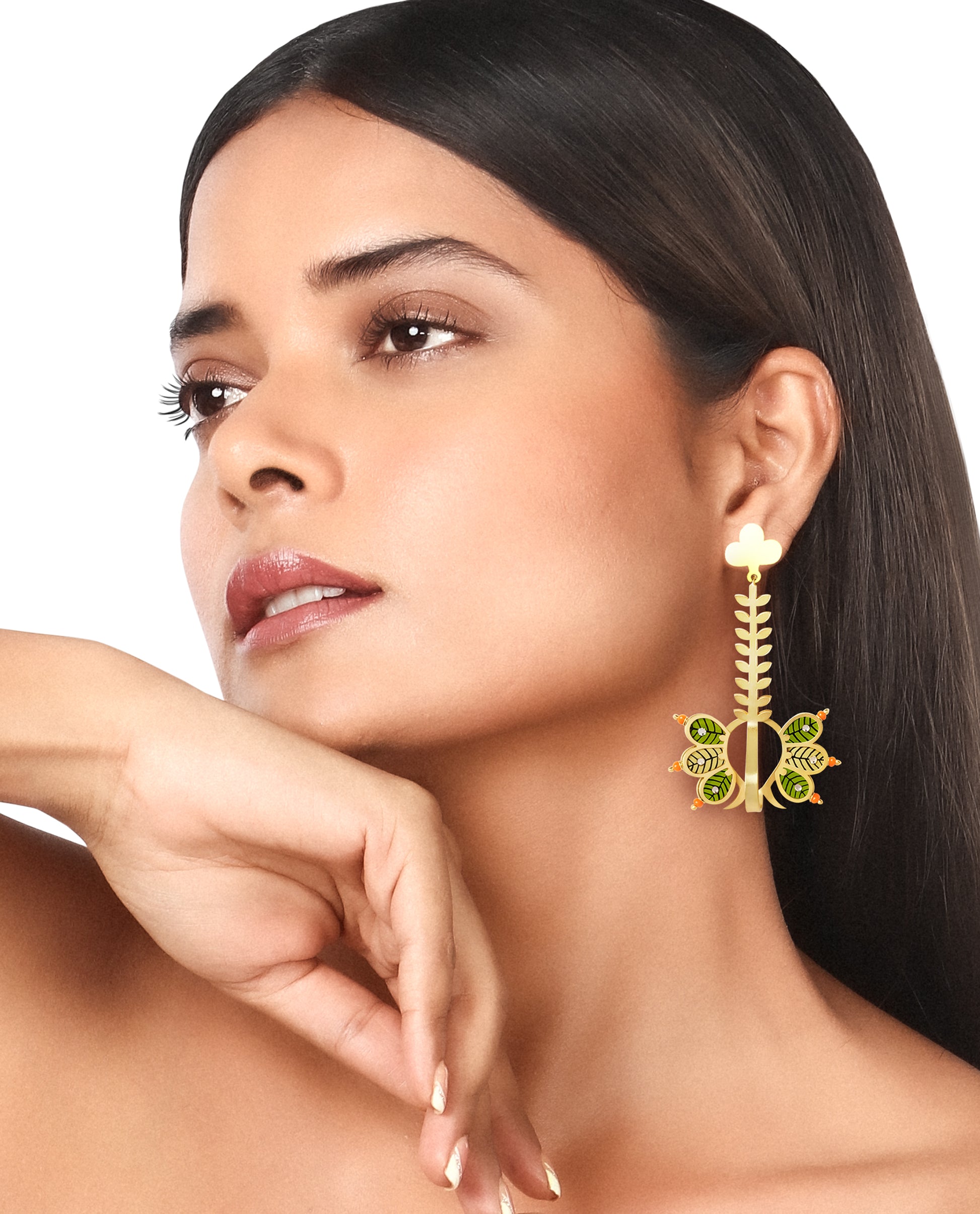 Hanging from a beautiful cloud, the Gajwani Earrings is designed with a gorgeous protruding elephant trunk with a gentle curve. The essence of the forest is etched in the delicate gold-plated leaf pattern in the middle. The lovely piece is finished off with a gorgeous combination of green and yellow Mahua pod form and the traditional signature Gond pattern.