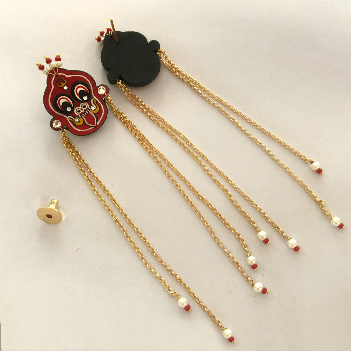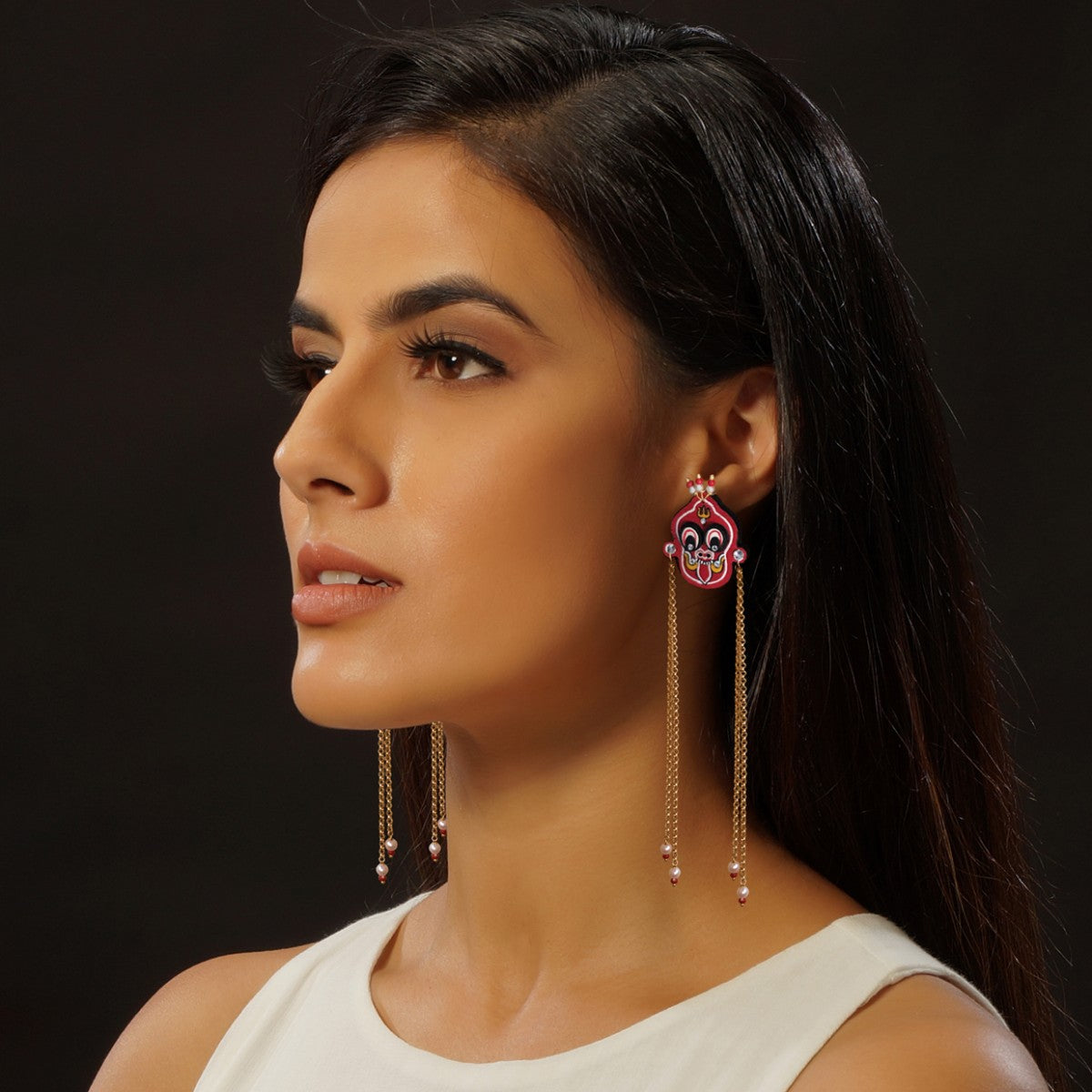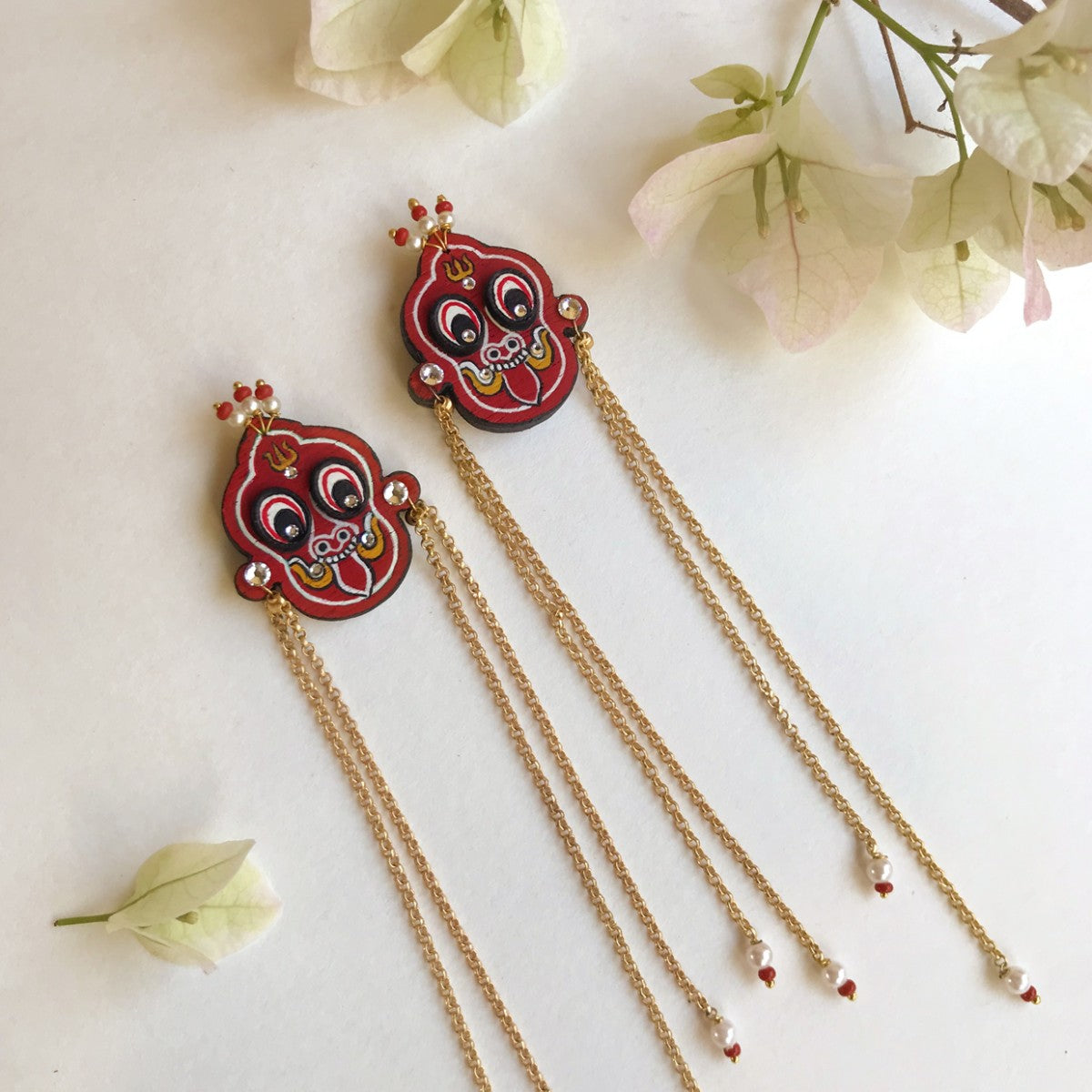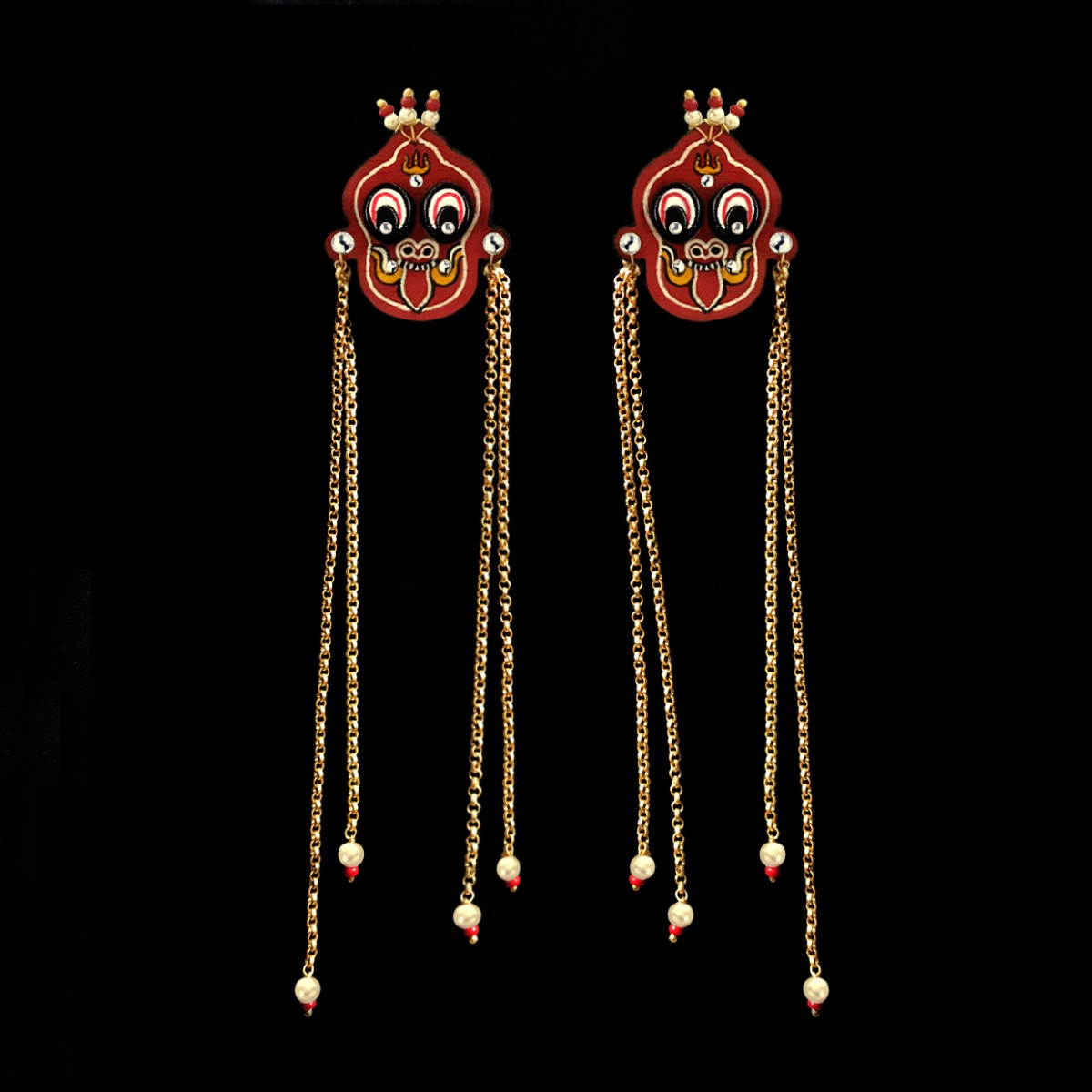 The Theyyam collection draws inspiration from the ritualistic art form of North Kerala. The colorful masks and imaginative costumes of this dance form the background of this eclectic collection. In a riot of colors, patterns, and folk art, you’ll discover that God is truly found in the details. Each piece of jewelry is one-of-a-kind, and the attempt has been to capture the intensity and energy of the dance form. Hand-painted and crafted by artists on layered wood. Embellished with gold-finished brass and silver-foil crystals. Strung together with glass beads from the traditional community of Patwas, this jewelry exemplifies the designer’s idea of giving the art of India a whole new destination—on the person of a woman.