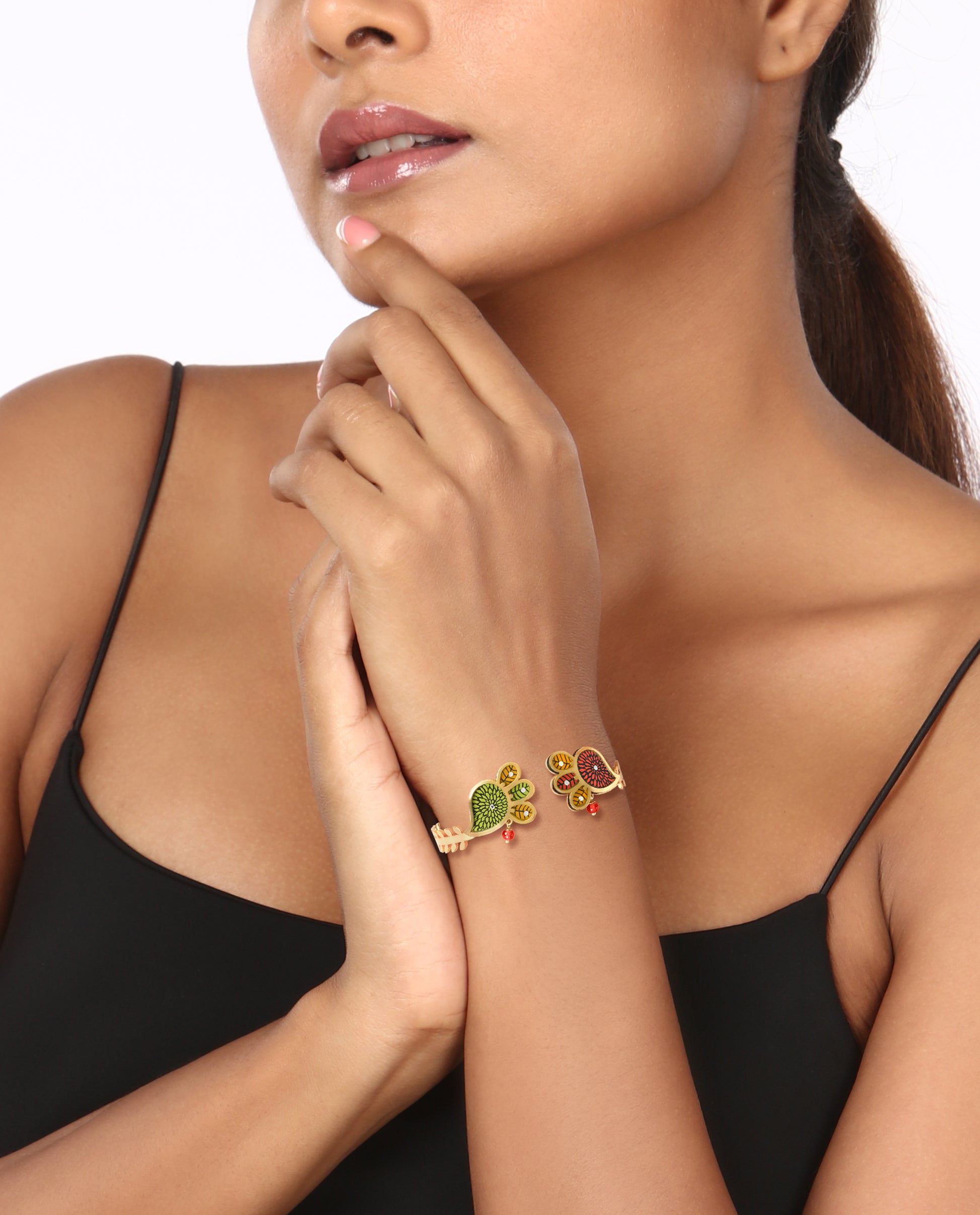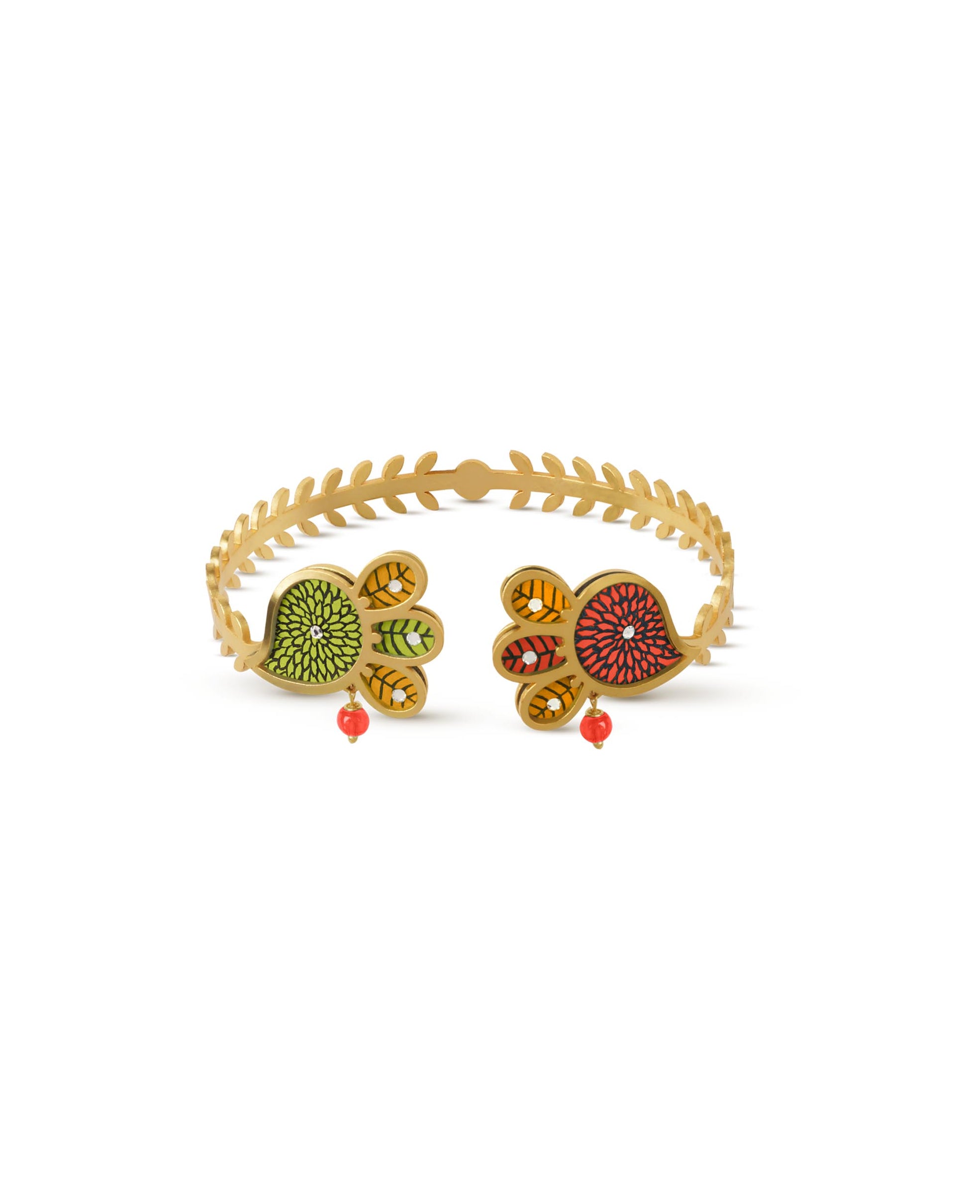 This exquisite Hathi Sathi Gond Art Bracelet embodies the Gond tribal legend of the flying elephant, a symbol of boundless possibility. Crafted in gold-plated brass, it captures the essence of defying gravity and embracing the extraordinary. The elephant's winged ears, intricately hand-painted on wood, showcase the meticulous artistry of Gond tradition. Delicate glass beads and gold dipped brass add a touch of opulence, evoking the rich tapestry of Gond mythology. More than mere adornment, this piece serves as a wearable reminder that with belief, we too can transcend our limitations and soar to new heights, just like the magical flying elephant of Gond lore.