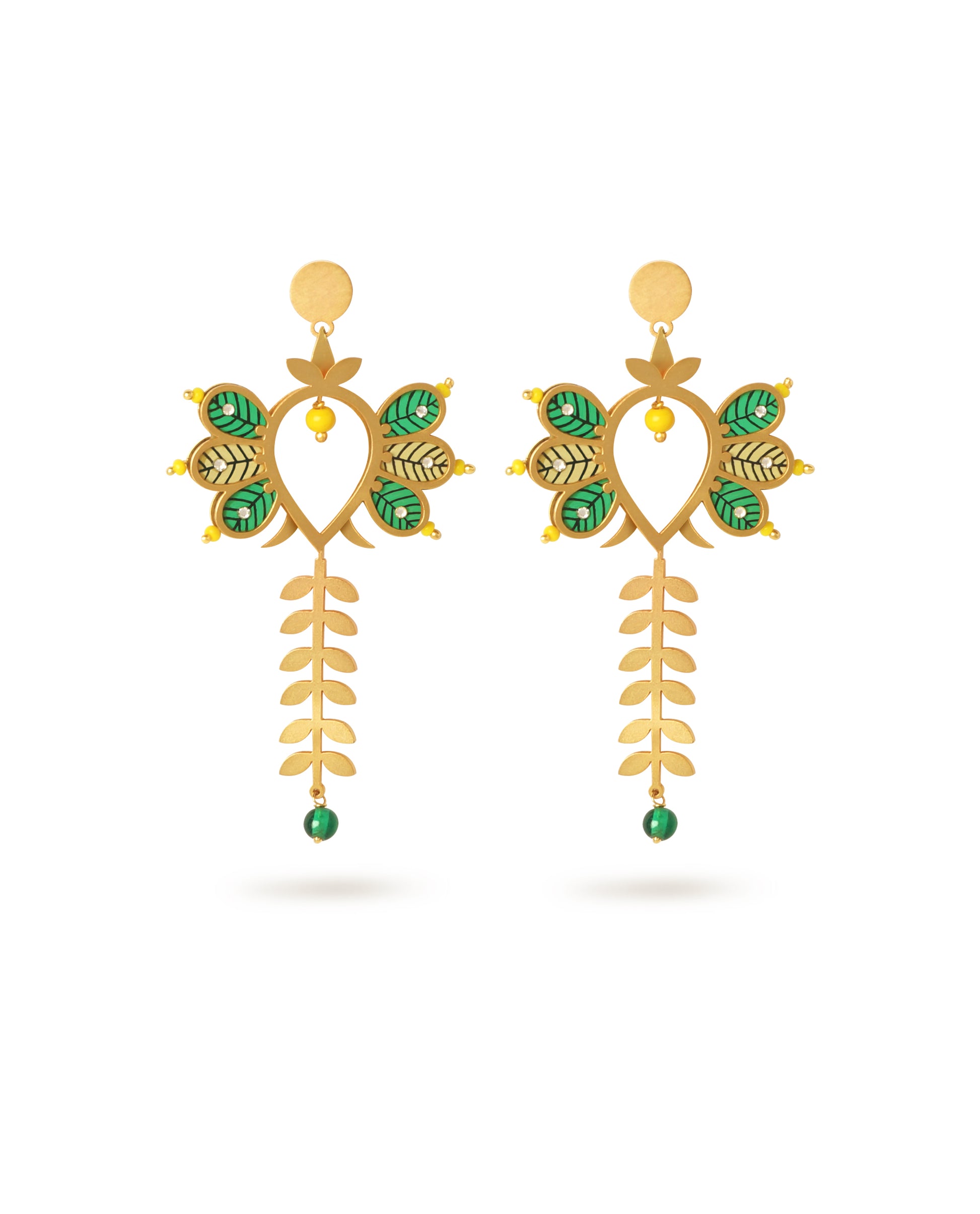 Introducing 'Hawaraj Gond Art Earring', Madhya Pradesh Gond tribal art-inspired wearable art, a tribute to the Gond legend of winged elephants celestial origins and its earthly fate. These unique earrings, showcase the majestic elephant rendered in layered wood and hand painted traditional tribal Gond Art patterns. Encased in gold dipped brass, highlighting the Mahua pod shaped winged ears and gold leaf trunk root the design clearly to the lush forest of Gondvani bridging the gap between sky and earth. As you adorn these Hawaraj Gond Art Earrings, feel the weight of the ancient lore and the lightness of imagination May they inspire you to see the world through the lens of Gond wisdom, where the boundary between earth and heaven is as fluid as an elephant's forgotten flight.