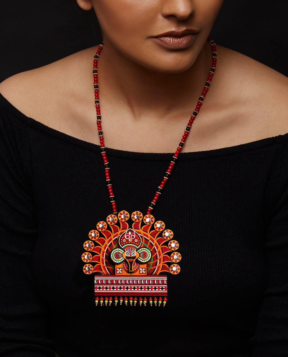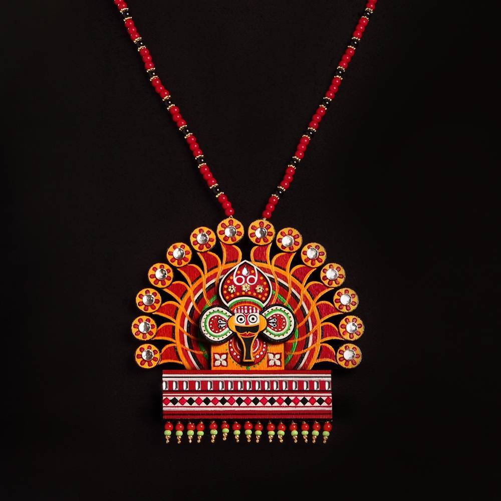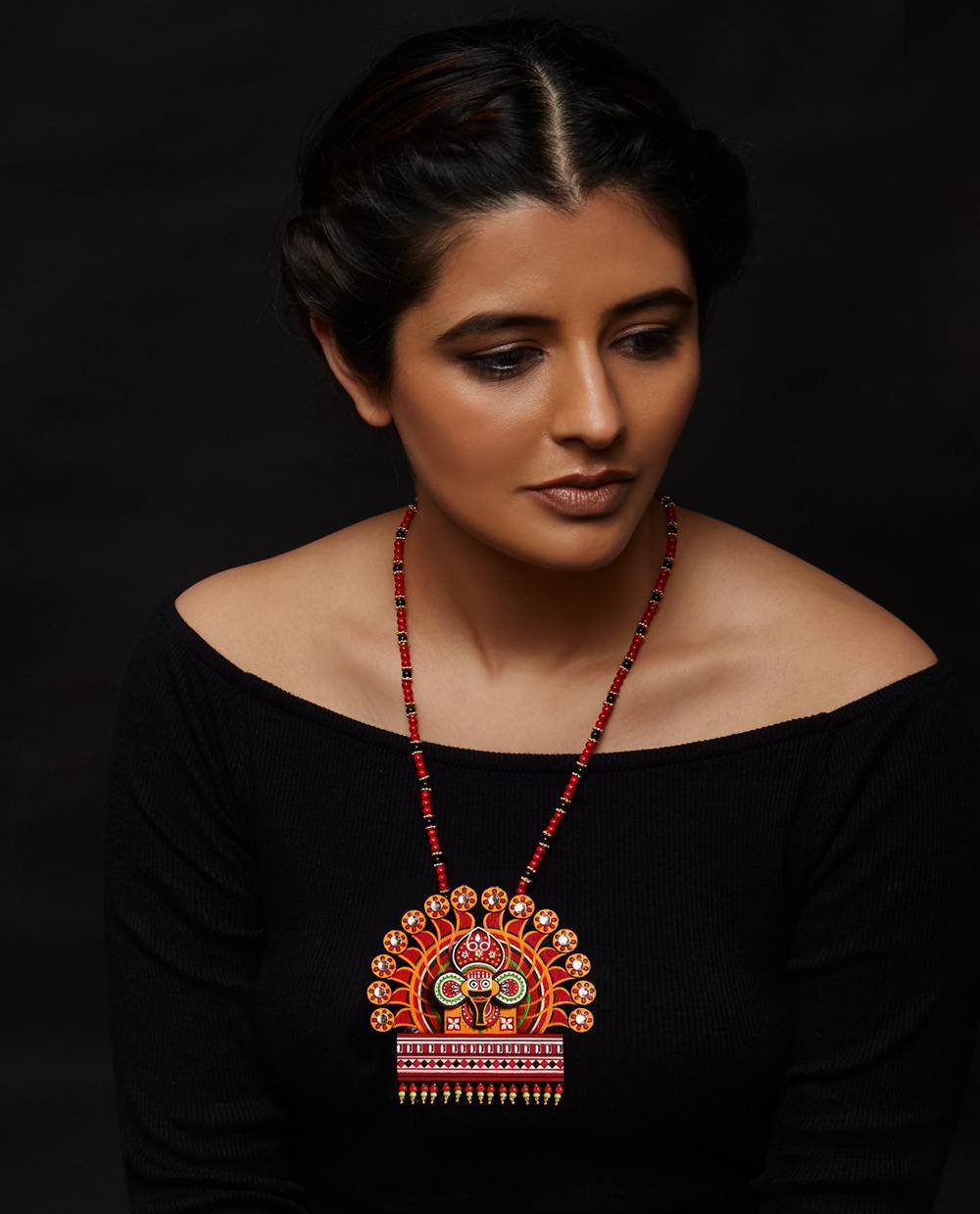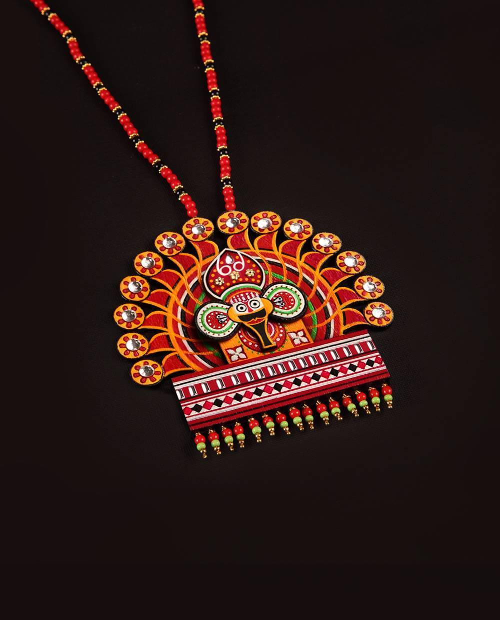 The Kutti Necklace and Earrings capture the mystical essence and fierce energy of this powerful Theyyam form through thoughtfully crafted adornments. Each piece in this collection is a wearable storytelling medium that translates the sacred art form's elements into contemporary jewellery. Each piece is handcrafted, ensuring the preservation of artistic authenticity maintaining respect for the sacred traditions while making them accessible as wearable art.