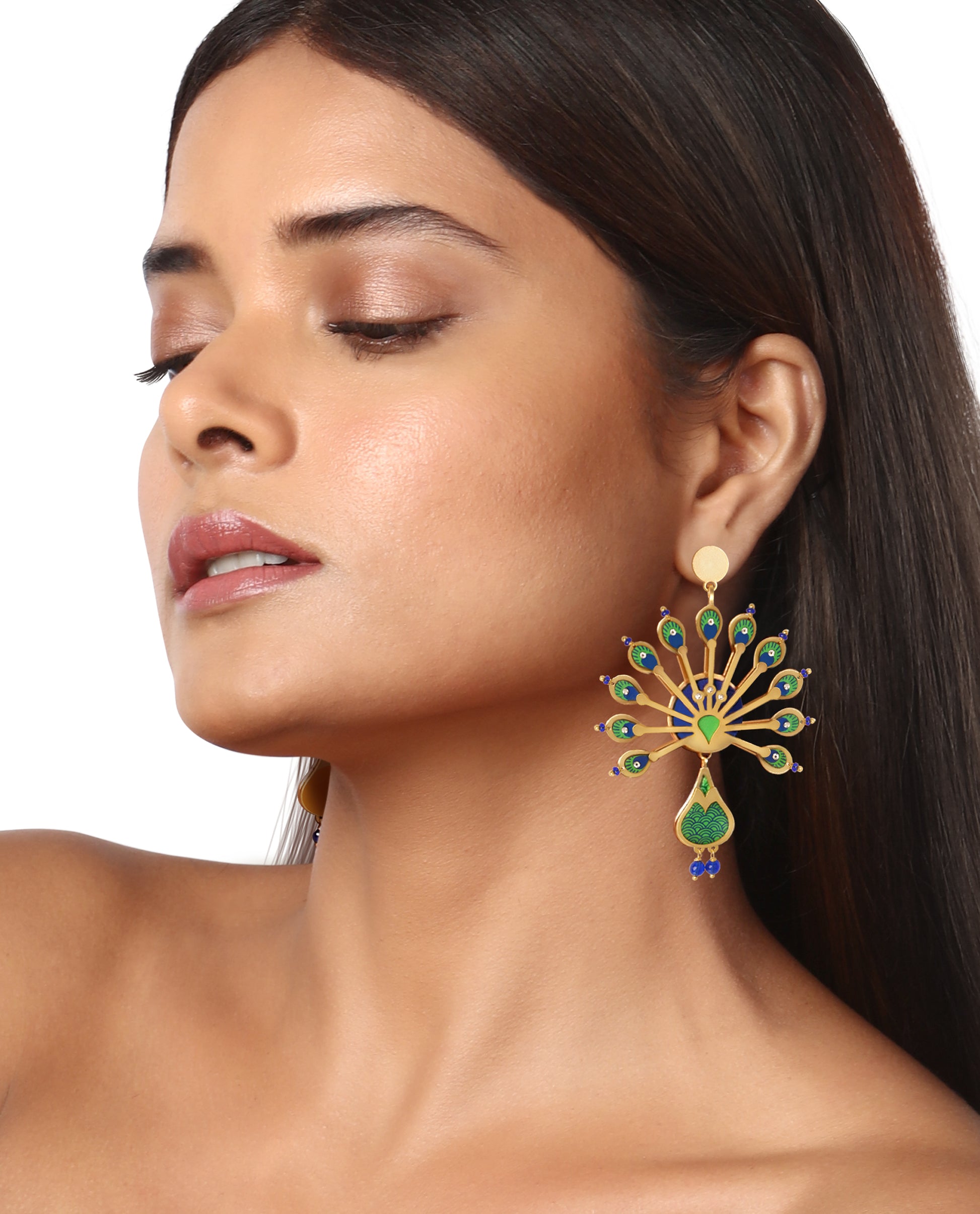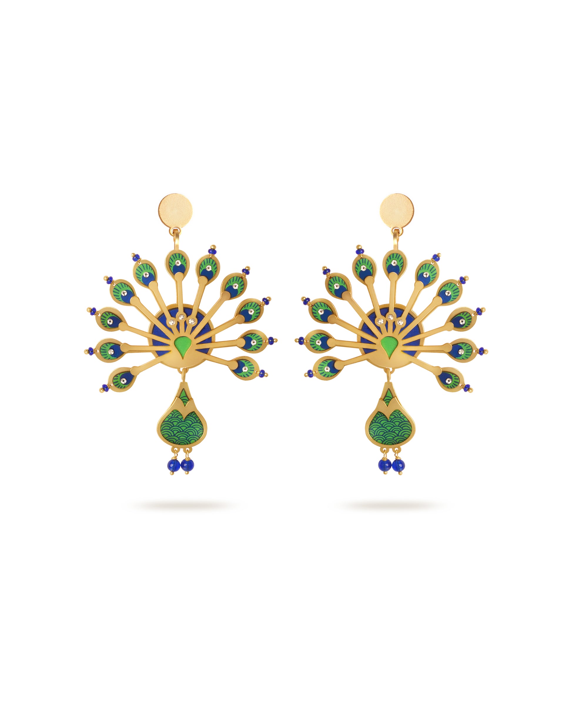The Gond tribal legend inspired Mor Pankh Gond Art Earrings available as earrings, brooch and necklace, capture the peacock’s uplifted, shimmering tail in dazzling display. Hand painted in the signature Gond pattern and suspended from the gold stud, this earrings creates movement, bringing the bird's splendour to life. Each earring tells a story of divine creation and humble beauty, reminding wearers of nature's perfect imperfections. & As you wear these exquisite earrings, you embrace both the glory of your achievements and the humility that grounds you, just as the peacock's magnificent plumage is balanced by its modest feet.