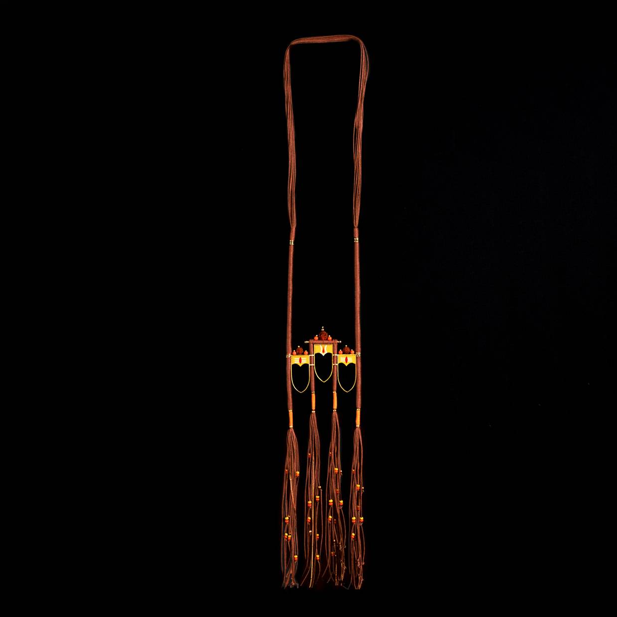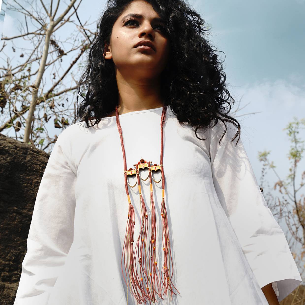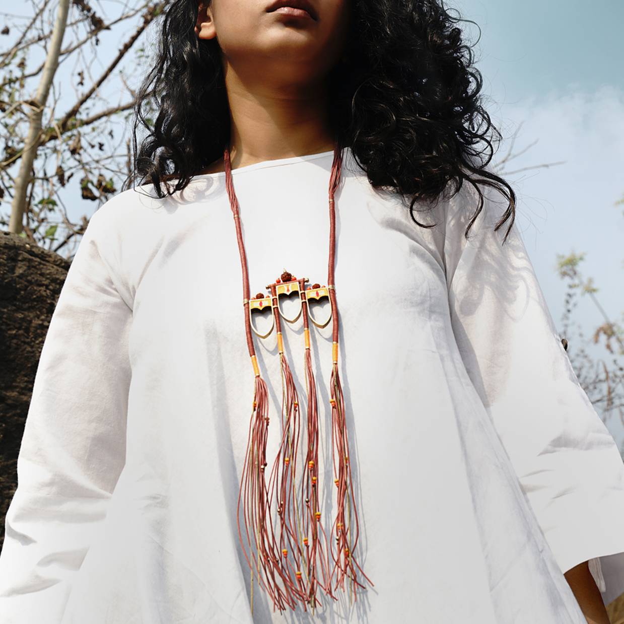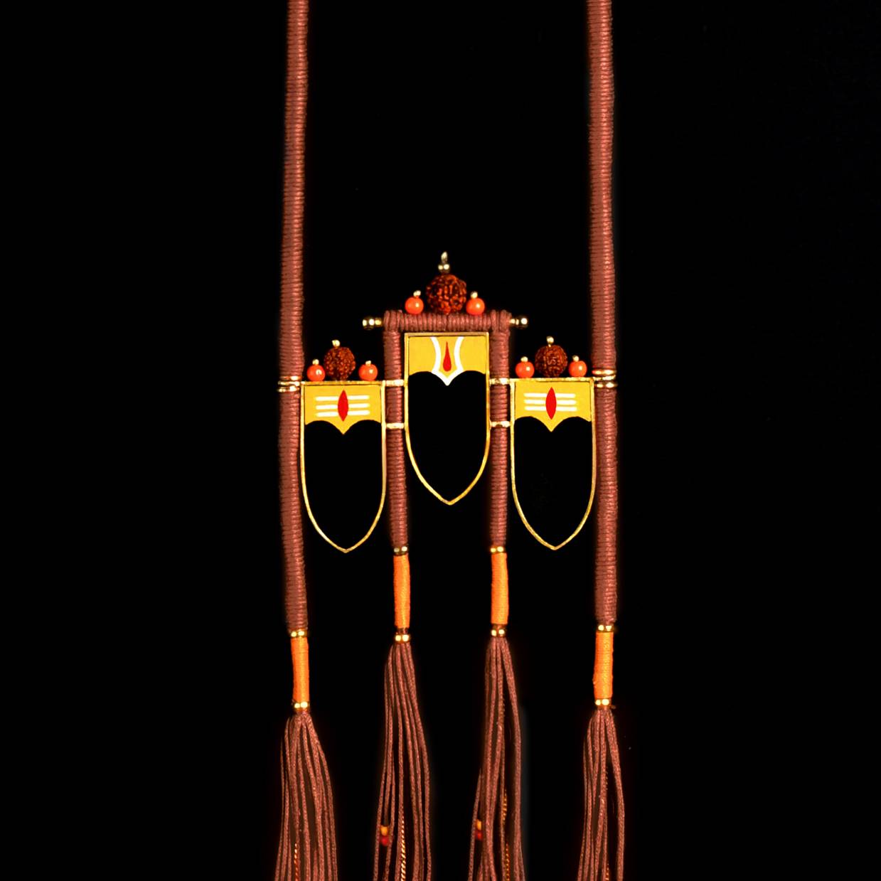 This unique necklace is handcrafted by weaving in cotton cords together, joined by Rudraksha and three Shiv Lingas that represent the three free-flowing rivers, Ganga, Yamuna and Saraswati. Just as a dip in this confluence leads to ultimate liberation, this piece of art gives any attire the absolute enlightenment.