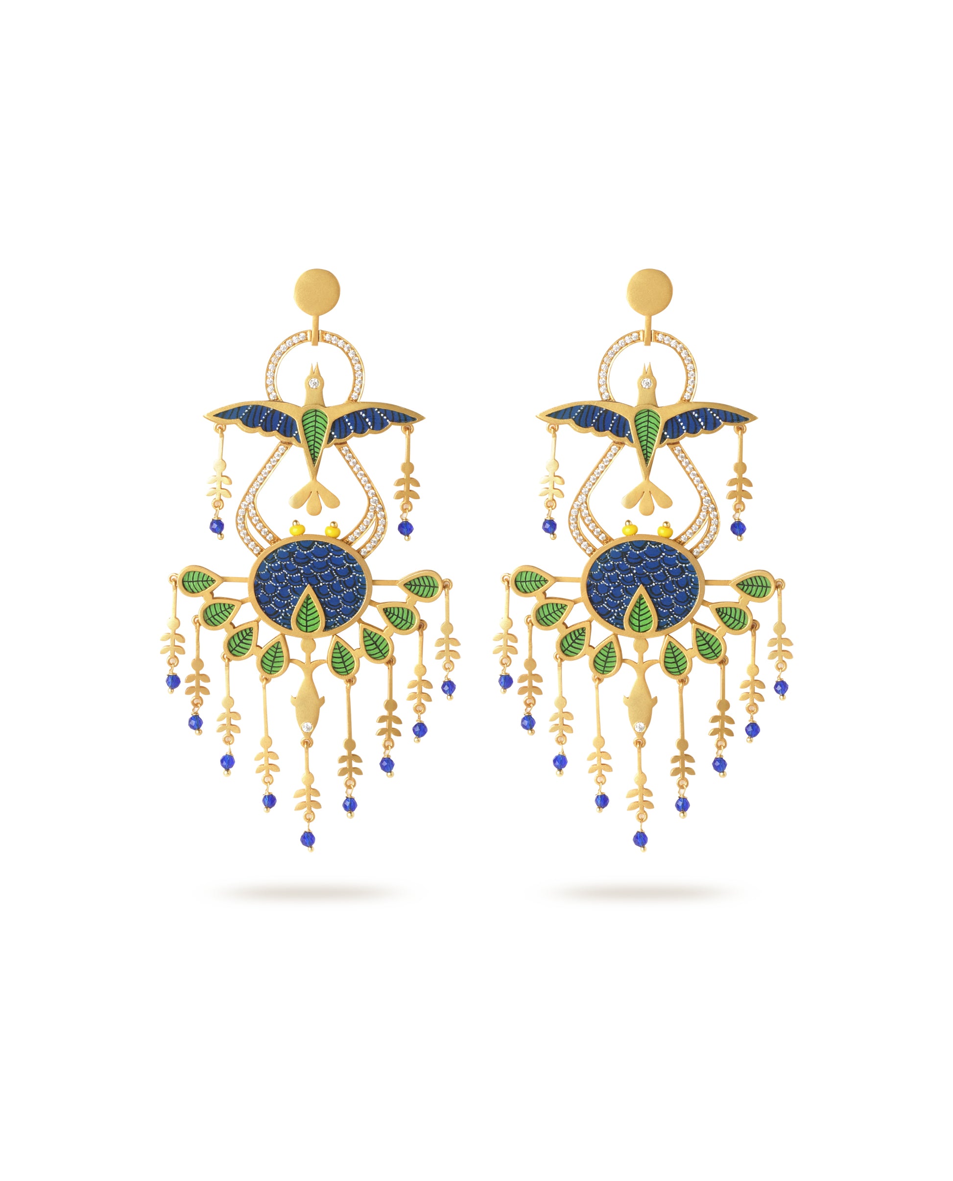 A cosmic journey unfolds through intricate motifs and vibrant hues, as the blue crow and crab's quest for Earth's creation comes alive in this unique 'Prithvi Rachna Gond Art Earrings' also available as earrings. The sacred Mahua pod form and detailed Gond patterns of dots and lines, weave through the design, emphasising the rich tapestry of Gond folklore. This Gond tribal art-inspired wearable art jewellery reimagines an ancient tale, elegantly captured in every detail, connecting the wearer to a timeless narrative of the earth's origin.