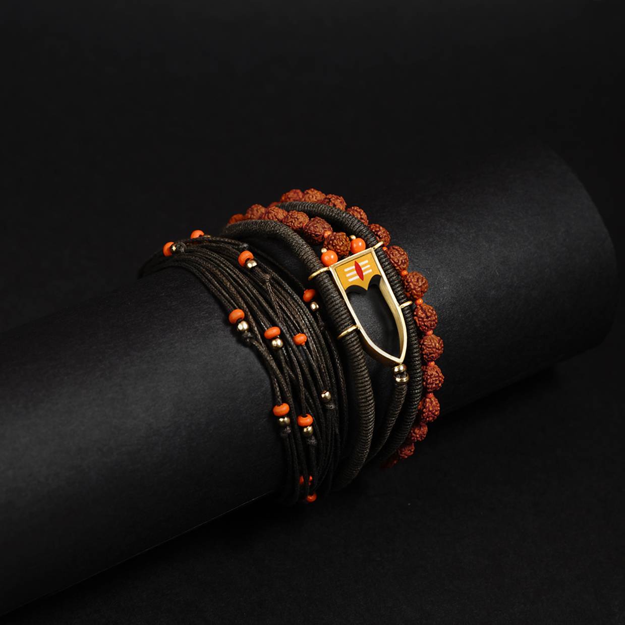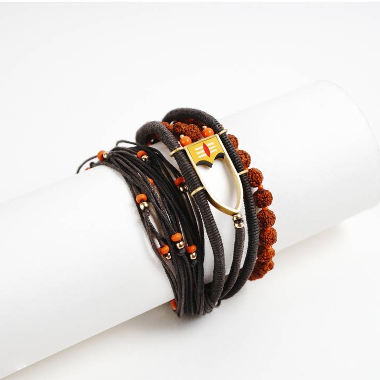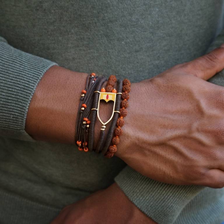 Many Rudrakshas, Cotton cords, vermillion, golden beads, gold plated metal and wood come together to perform the ultimate dance ever, on your wrist with this wrap Moksha bracelet.