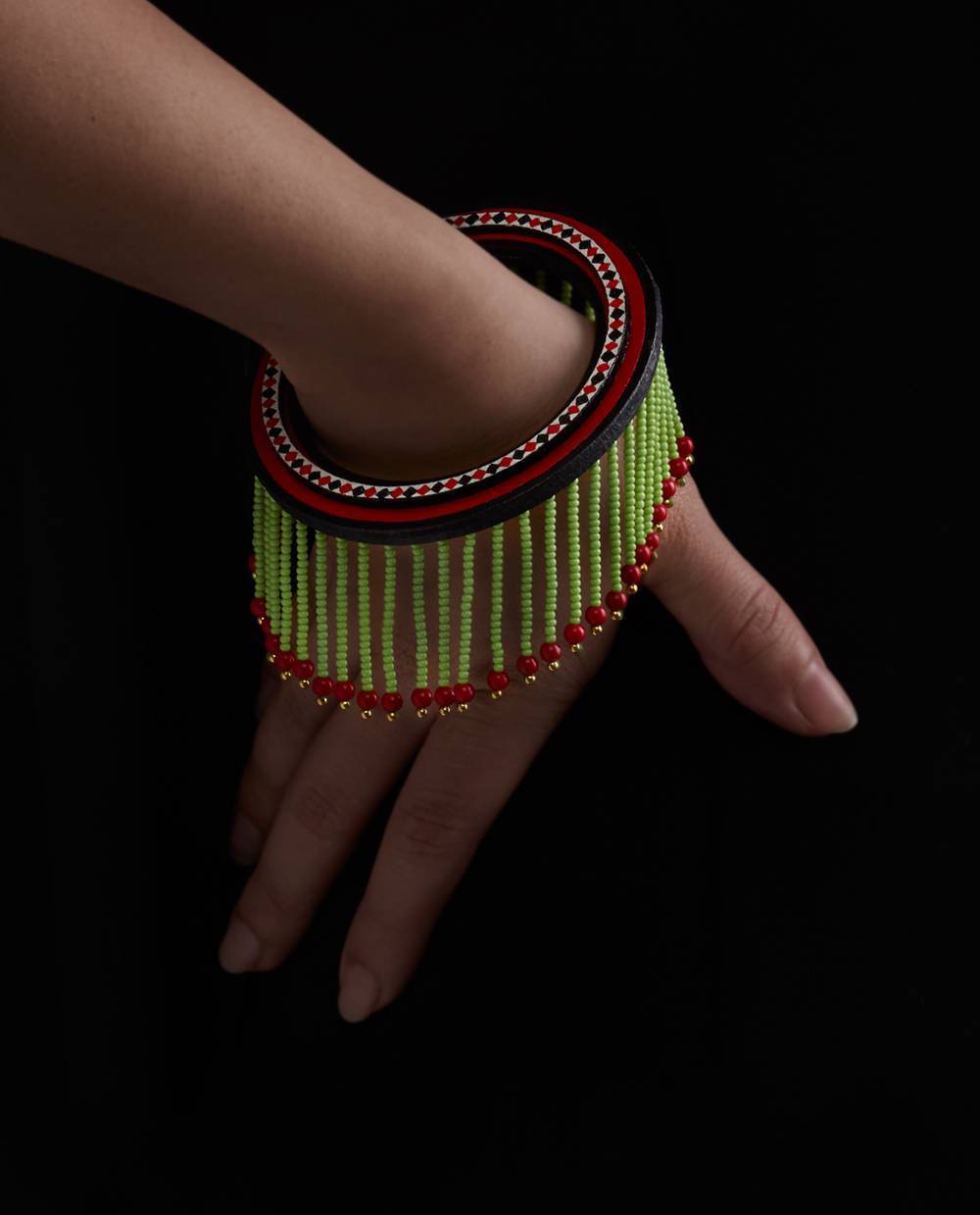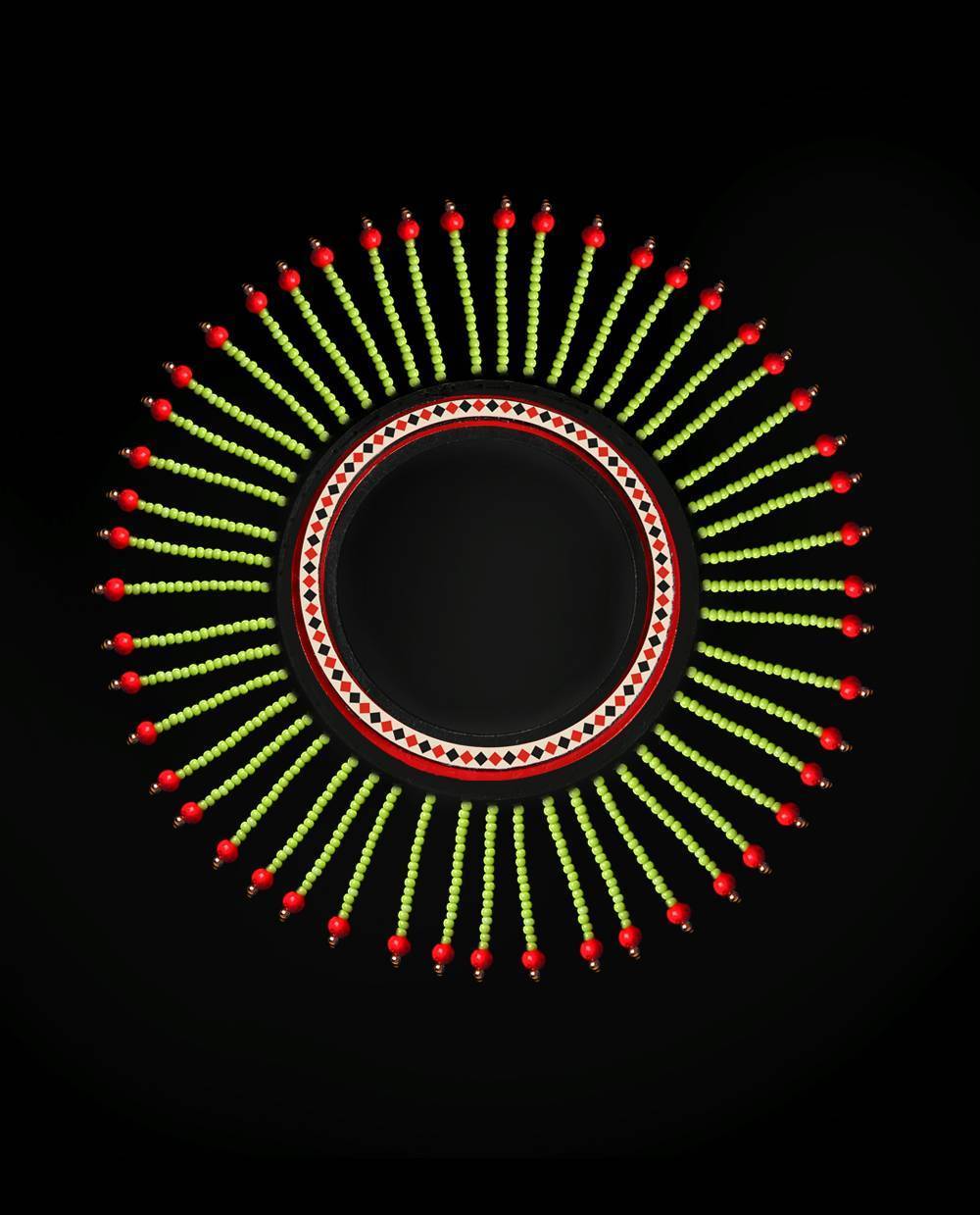 The Theyyam collection draws inspiration from the ritualistic art form of North Kerala. The colorful masks and imaginative costumes of this dance form the background of this eclectic collection. In a riot of colors, patterns, and folk art, you’ll discover that God is truly found in the details. Each piece of jewelry is one-of-a-kind, and the attempt has been to capture the intensity and energy of the dance form. Hand-painted and crafted by artists on layered wood. Embellished with gold-finished brass and silver-foil crystals. Strung together with glass beads from the traditional community of Patwas, this jewelry exemplifies the designer’s idea of giving the art of India a whole new destination—on the person of a woman.