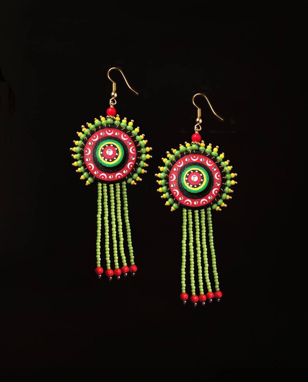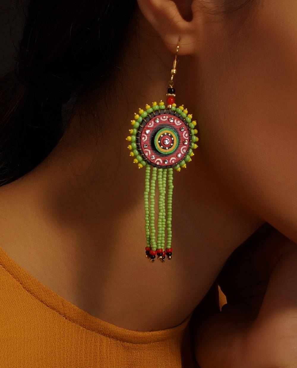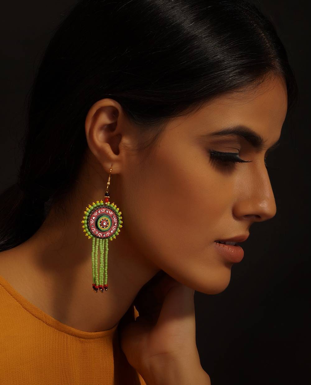 The Theyyam collection draws inspiration from the ritualistic art form of North Kerala. The colorful masks and imaginative costumes of this dance form the background of this eclectic collection. In a riot of colors, patterns, and folk art, you’ll discover that God is truly found in the details. Each piece of jewelry is one-of-a-kind, and the attempt has been to capture the intensity and energy of the dance form. Hand-painted and crafted by artists on layered wood. Embellished with gold-finished brass and silver-foil crystals. Strung together with glass beads from the traditional community of Patwas, this jewelry exemplifies the designer’s idea of giving the art of India a whole new destination—on the person of a woman.