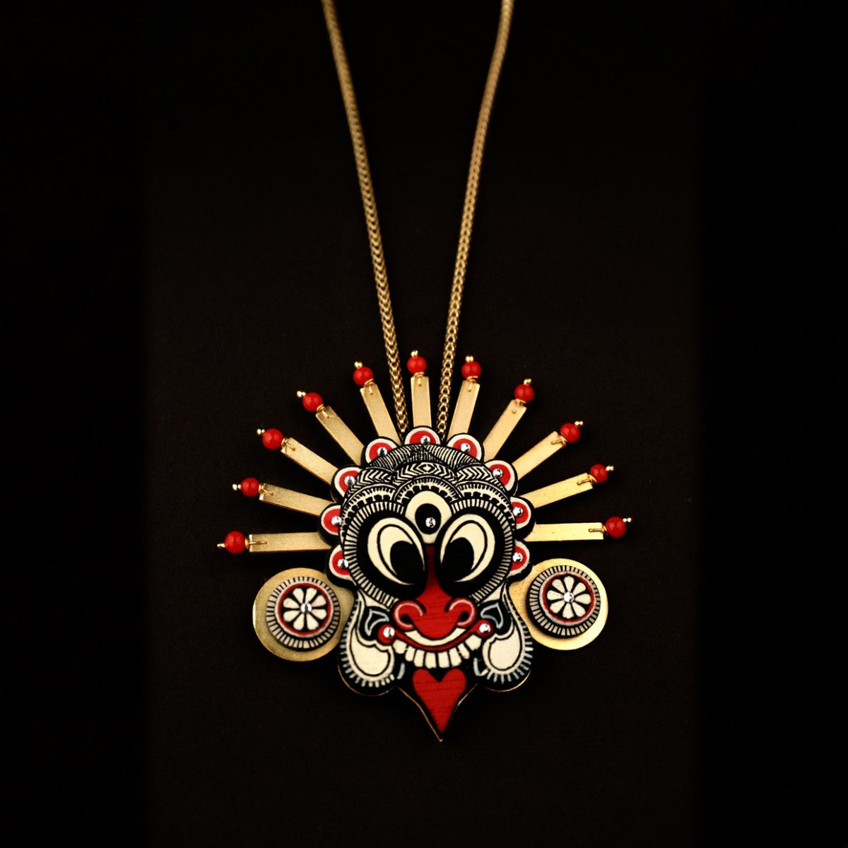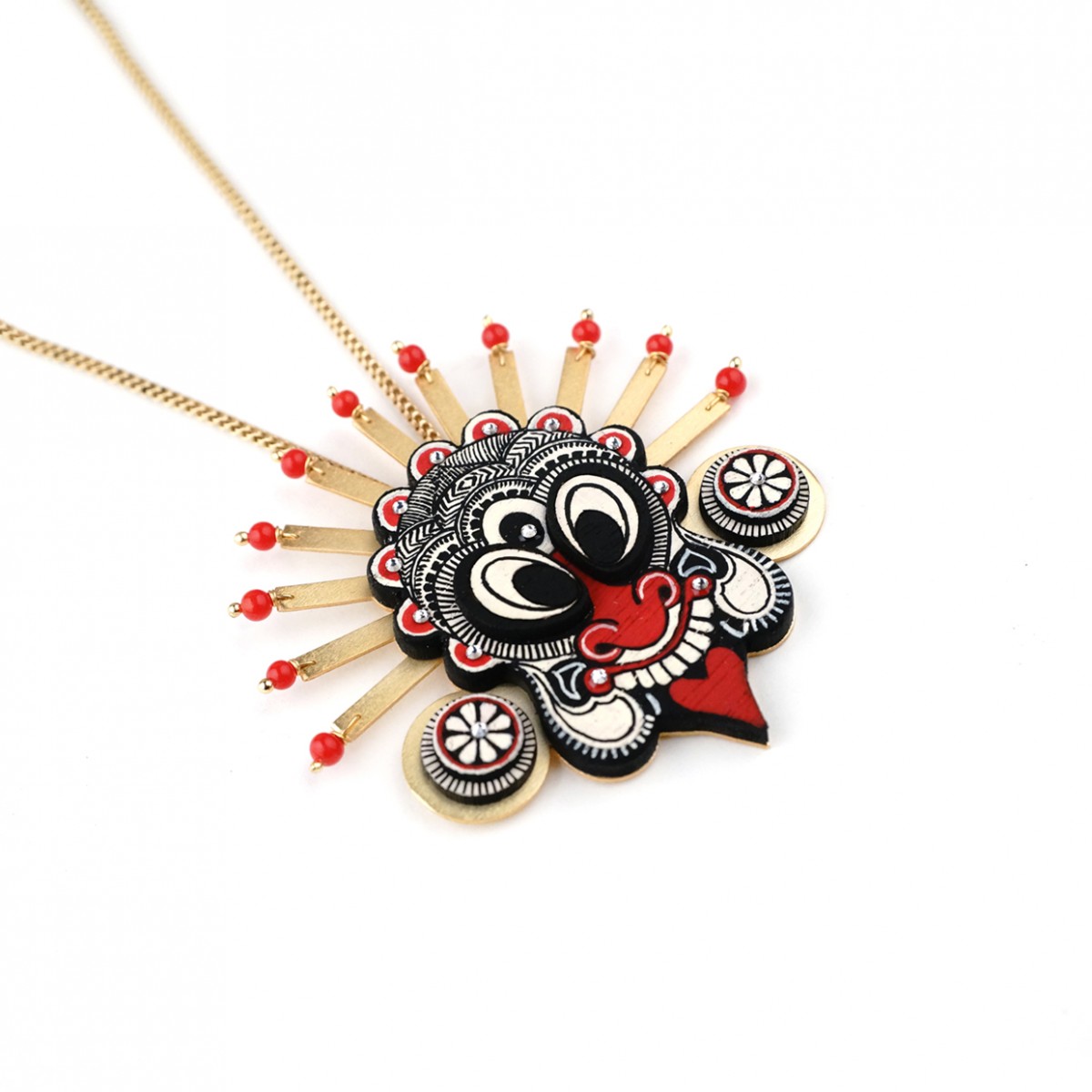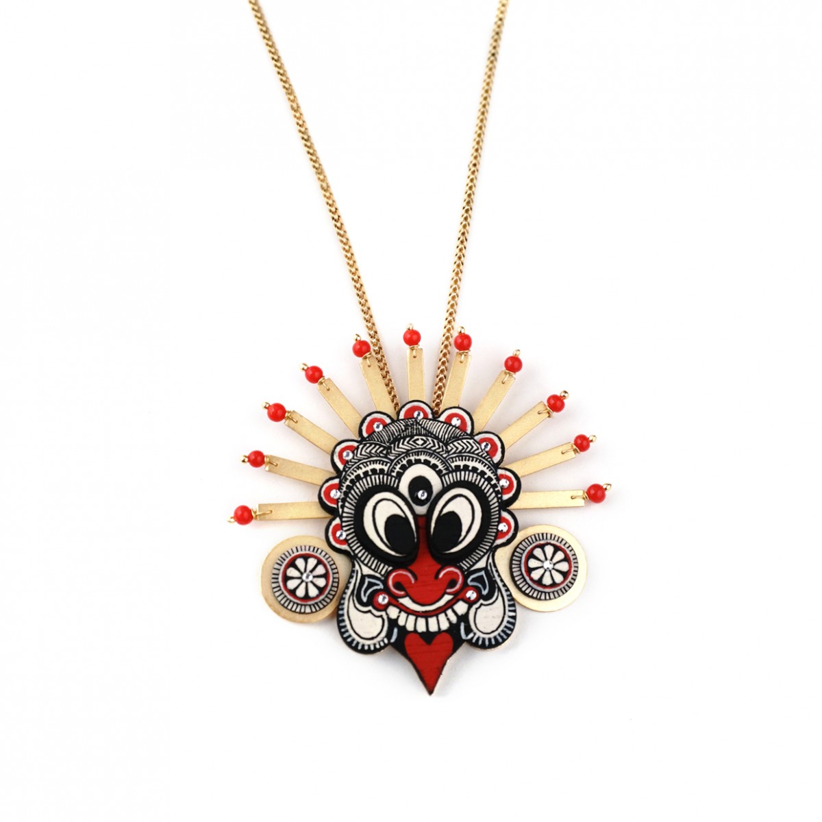 The Padayani necklace, earrings and brooch translates this powerful ritual into wearable art. Inspired by the traditional palm frond masks used in the ceremony, each handcrafted piece captures the mystical essence of this sacred art form while carrying its protective energies and blessings.