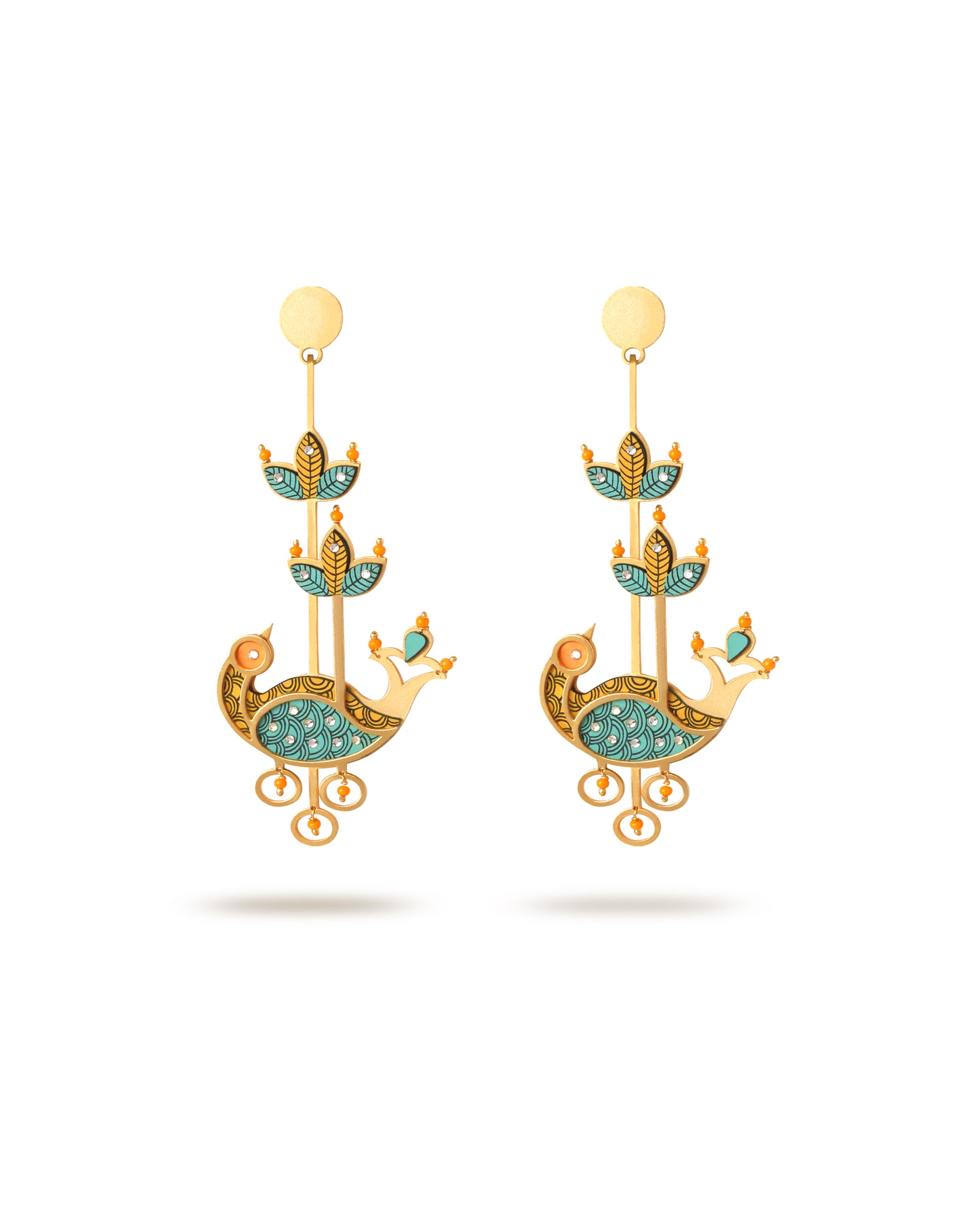 These exquisite Madhya Pradesh Gond tribal art-inspired 'Tithi Chirai Gond Art Earrings' bring to life the ancient Gond folklore of the vigilant mother bird, transforming myth into wearable art. Hand-painted with signature Gond patterns, the bird's delicate form and posture embodies eternal vigilance. Nestled beneath the watchful mother are three tiny eggs with suspended glass beads that complete the narrative. More than mere adornments, these earrings are wearable stories celebrating Gond tribal wisdom, a mother's love, and the enduring spirit of nature's small wonders.